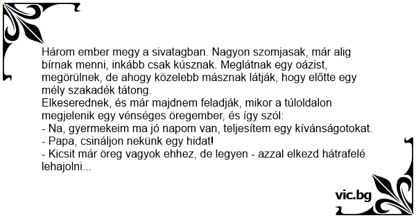 Három ember megy a sivatagban. Nagyon szomjasak, már alig bírnak menni, inkább csak kúsznak. Meglátnak egy oázist, megörülnek, de ahogy közelebb másznak látják, hogy előtte egy mély szakadék tátong.