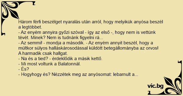 Három férfi beszélget nyaralás után arról, hogy melyikük anyósa beszél a legtöbbet.