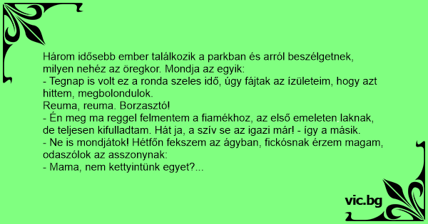 - Én meg ma reggel felmentem a fiamékhoz, az első emeleten laknak, de teljesen kifulladtam. Hát ja, a szív se az igazi már! - így a másik.