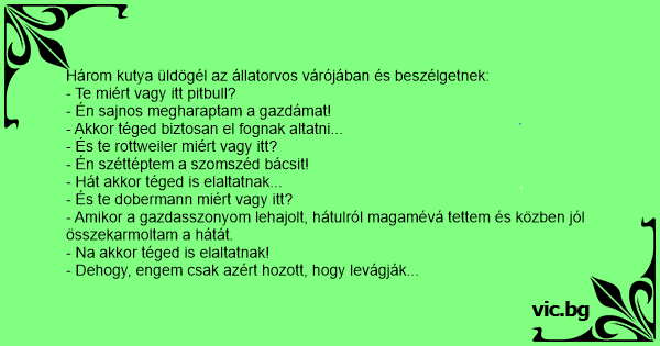Három kutya üldögél az állatorvos várójában és beszélgetnek: