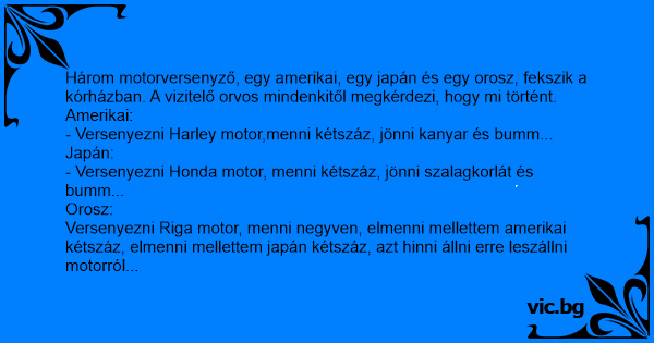 Három motorversenyző, egy amerikai, egy japán és egy orosz, fekszik a kórházban. A vizitelő orvos mindenkitől megkérdezi, hogy mi történt.