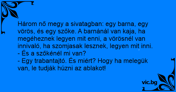 Három nő megy a sivatagban: egy barna, egy vörös, és egy szőke. A barnánál van kaja, ha megéheznek legyen mit enni, a vörösnél van innivaló, ha szomjasak lesznek, legyen mit inni.