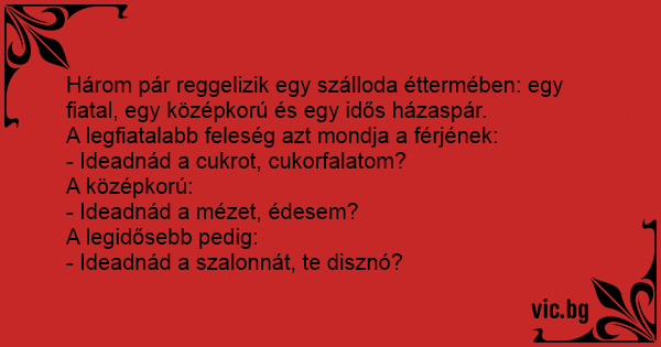Három pár reggelizik egy szálloda éttermében: egy fiatal, egy középkorú és egy idős házaspár.