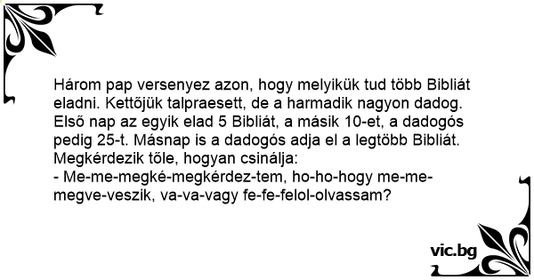 Három pap versenyez azon, hogy melyikük tud több Bibliát eladni. Kettőjük talpraesett, de a harmadik nagyon dadog. Első nap az egyik elad 5 Bibliát, a másik 10-et, a dadogós pedig 25-t. Másnap is a dadogós adja el a legtöbb Bibliát. Megkérdezik tőle, hogyan csinálja:
