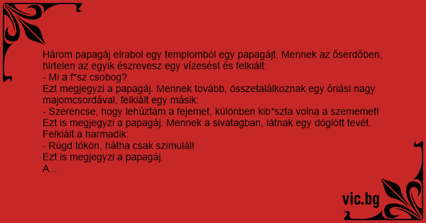 - Szerencse, hogy lehúztam a fejemet, különben kib*szta volna a szememet! - A pap elájul, a papagáj folytatja: