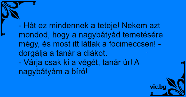 - Hát ez mindennek a teteje! Nekem azt mondod, hogy a nagybátyád temetésére mégy, és most itt látlak a focimeccsen! - dorgálja a tanár a diákot.