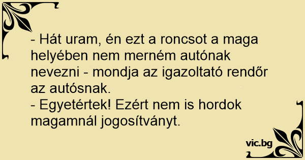 - Hát uram, én ezt a roncsot a maga helyében nem merném autónak nevezni - mondja az igazoltató rendőr az autósnak.