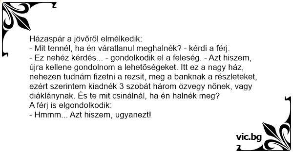 - Ez nehéz kérdés... - gondolkodik el a feleség. - Azt hiszem, újra kellene gondolnom a lehetőségeket. Itt ez a nagy ház, nehezen tudnám fizetni a rezsit, meg a banknak a részleteket, ezért szerintem kiadnék 3 szobát három özvegy nőnek, vagy diáklánynak. És te mit csinálnál, ha én halnék meg?