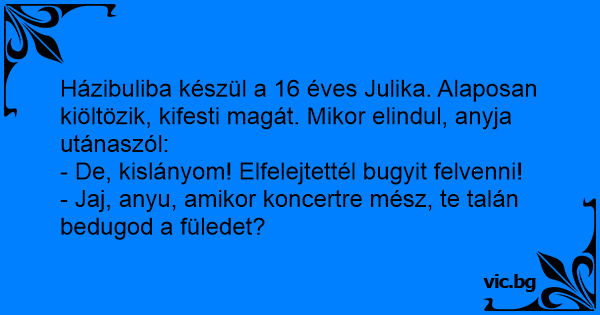 Házibuliba készül a 16 éves Julika. Alaposan kiöltözik, kifesti magát. Mikor elindul, anyja utánaszól: