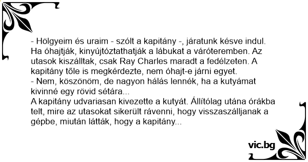 - Hölgyeim és uraim - szólt a kapitány -, járatunk késve indul. Ha óhajtják, kinyújtóztathatják a lábukat a váróteremben. Az utasok kiszálltak, csak Ray Charles maradt a fedélzeten. A kapitány tőle is megkérdezte, nem óhajt-e járni egyet.