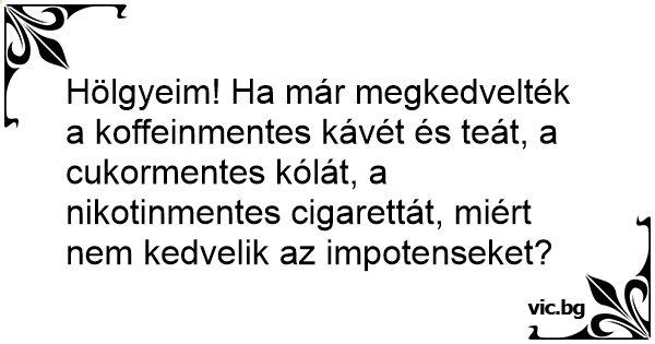 Hölgyeim! Ha már megkedvelték a koffeinmentes kávét és teát, a cukormentes kólát, a nikotinmentes cigarettát, miért nem kedvelik az impotenseket?