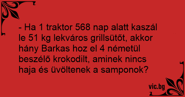 - Ha 1 traktor 568 nap alatt kaszál le 51 kg lekváros grillsütőt, akkor hány Barkas hoz el 4 németül beszélő krokodilt, aminek nincs haja és üvöltenek a samponok?