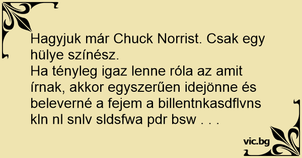 Víte, já si stejnak myslím že všechny ty povídky o Chuckovi Norrisovi nejsou skutečné. Protože kdyby byl tak drsnej, tak by přišel a začal by mi mlátit hlavou do...