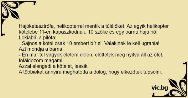 Hajókatasztrófa, helikopterrel mentik a túlélőket. Az egyik helikopter kötelébe 11-en kapaszkodnak: 10 szőke és egy barna hajú nő. Lekiabál a pilóta: