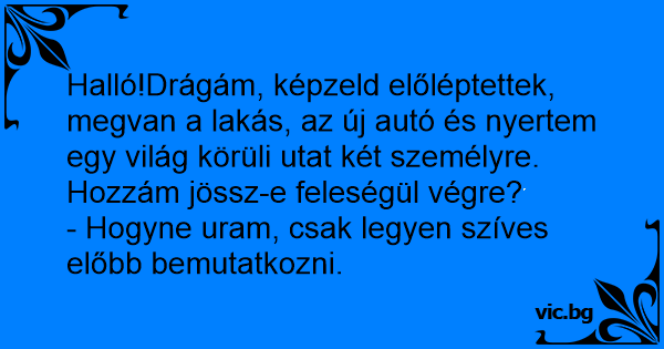 Halló!Drágám, képzeld előléptettek, megvan a lakás, az új autó és nyertem egy világ körüli utat két személyre.