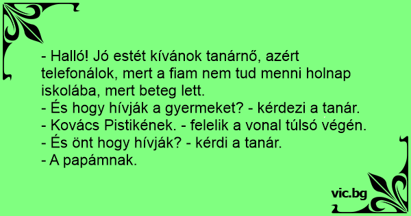 - Halló! Jó estét kívánok tanárnő, azért telefonálok, mert a fiam nem tud menni holnap iskolába, mert beteg lett.