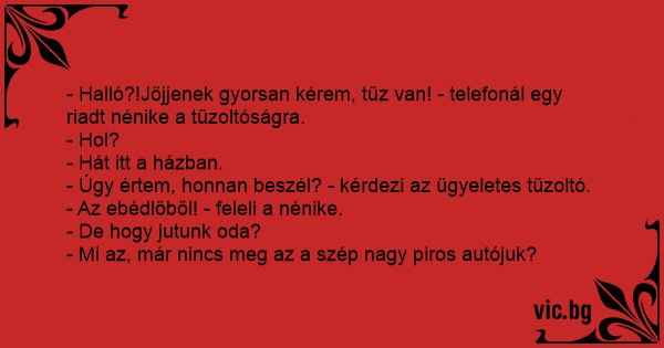 - Halló?!Jöjjenek gyorsan kérem, tűz van! - telefonál egy riadt nénike a tűzoltóságra.