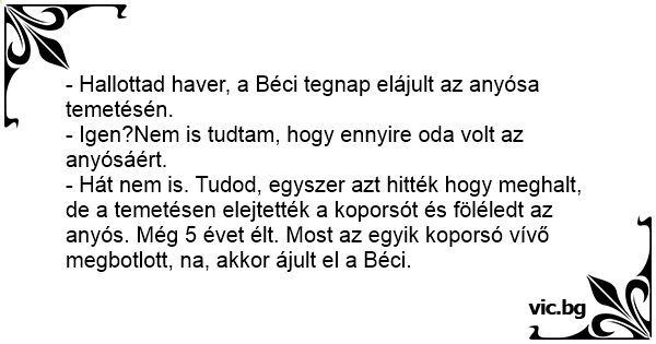 - Hát nem is. Tudod, egyszer azt hitték hogy meghalt, de a temetésen elejtették a koporsót és föléledt az anyós. Még 5 évet élt. Most az egyik koporsó vívő megbotlott, na, akkor ájult el a Béci.