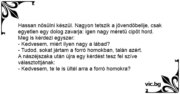 Hassan nősülni készül. Nagyon tetszik a jövendőbelije, csak egyetlen egy dolog zavarja: igen nagy méretű cipőt hord.