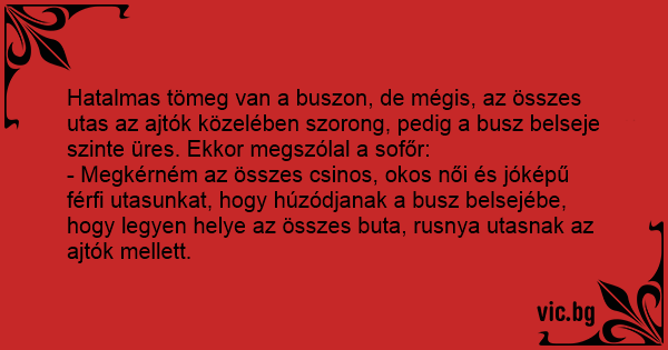 - Megkérném az összes csinos, okos női és jóképű férfi utasunkat, hogy húzódjanak a busz belsejébe, hogy legyen helye az összes buta, rusnya utasnak az ajtók mellett.