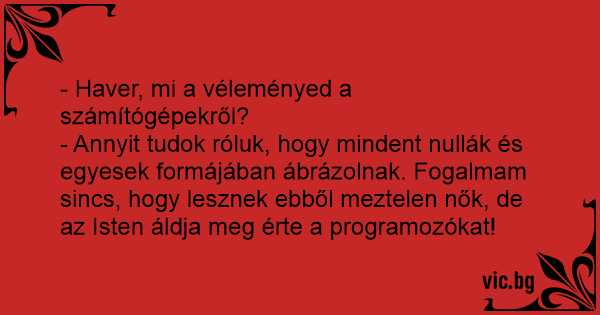 - Annyit tudok róluk, hogy mindent nullák és egyesek formájában ábrázolnak. Fogalmam sincs, hogy lesznek ebből meztelen nők, de az Isten áldja meg érte a programozókat!