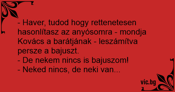 - Haver, tudod hogy rettenetesen hasonlítasz az anyósomra - mondja Kovács a barátjának - leszámítva persze a bajuszt.