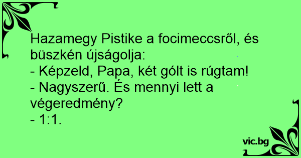 Hazamegy Pistike a focimeccsről, és büszkén újságolja: