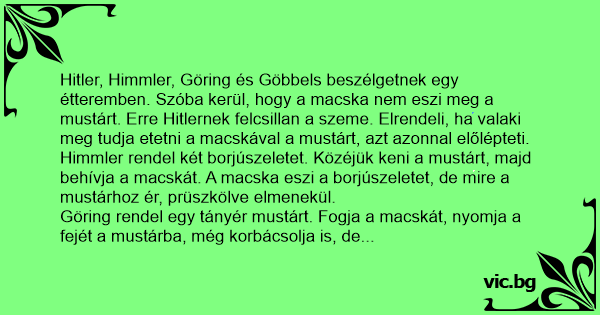 Göring rendel egy tányér mustárt. Fogja a macskát, nyomja a fejét a mustárba, még korbácsolja is, de a szerencsétlen állat csak nem hajlandó megenni.