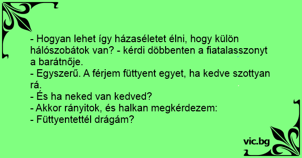 - Hogyan éltek házaséletet, ha külön szobában alusztok? - érdeklődik a barátnő. - Ez nálunk igen egyszerűen megy, a férjem füttyent egyet, ha kedve van hozzá. - És, ha neked támad kedved? - Akkor...
