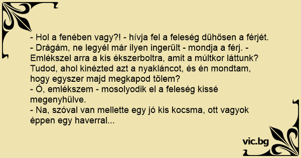 - Drágám, ne legyél már ilyen ingerült - mondja a férj. - Emlékszel arra a kis ékszerboltra, amit a múltkor láttunk? Tudod, ahol kinézted azt a nyakláncot, és én mondtam, hogy egyszer majd megkapod tőlem?