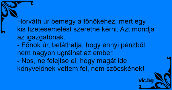 Horváth úr bemegy a főnökéhez, mert egy kis fizetésemelést szeretne kérni. Azt mondja az igazgatónak: