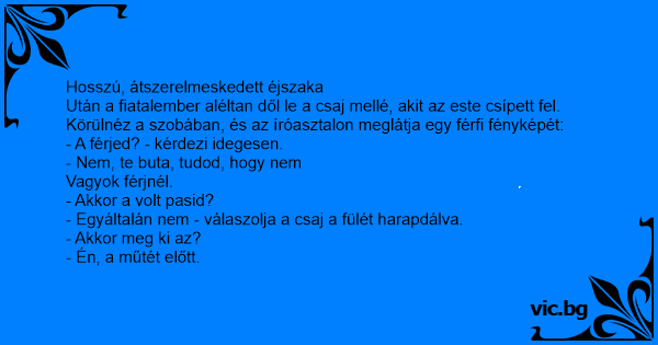 Etter en natt med mye sеx ser mannen ett bilde av en ainna mann på nattbordet. Han blir urolig og spør: - Er det din mann?! - Nei, selvfølgelig ikke, sier kvinnen og kryper nærmere mannen. - Er det...
