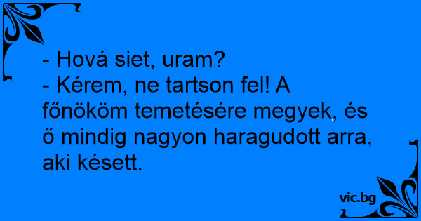 - Kérem, ne tartson fel! A főnököm temetésére megyek, és ő mindig nagyon haragudott arra, aki késett.