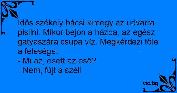 A székely bácsi kimegy az udvarra. Pár perc múlva bejön, és csupa víz a nadrágja. Az asszony megkérdezi tőle: - Mi van, ember, ennyire esik? - Nem, ennyire fúj!