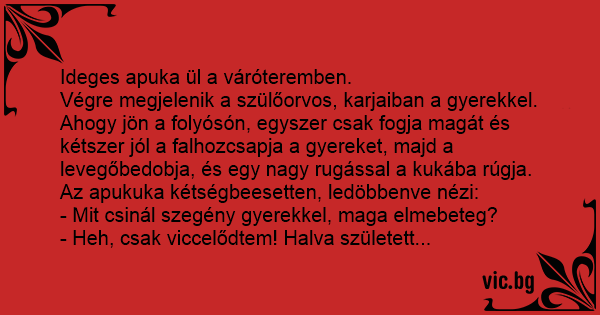 Végre megjelenik a szülőorvos, karjaiban a gyerekkel. Ahogy jön a folyósón, egyszer csak fogja magát és kétszer jól a falhozcsapja a gyereket, majd a levegőbedobja, és egy nagy rugással a kukába rúgja.