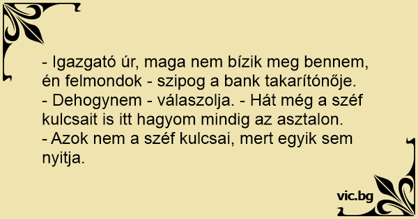 - Igazgató úr, maga nem bízik meg bennem, én felmondok - szipog a bank takarítónője.