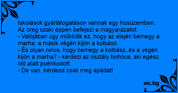 - És olyan nincs, hogy bemegy a kolbász, és a végén kijön a marha? - kérdezi az osztály bohóca, aki egész idő alatt poénkodott.