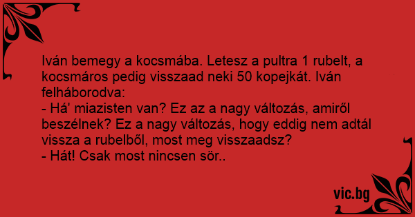 Iván bemegy a kocsmába. Letesz a pultra 1 rubelt, a kocsmáros pedig visszaad neki 50 kopejkát. Iván felháborodva: