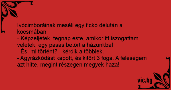 Ivócimboráinak meséli egy fickó délután a kocsmában: - Képzeljétek, tegnap este, amikor itt iszogattam veletek, egy pasas betört a házunkba! - És, mi történt? - kérdik a többiek. - Agyrázkódást kapott, és kitört 3 foga. A feleségem azt hitte, megint részegen megyek haza!