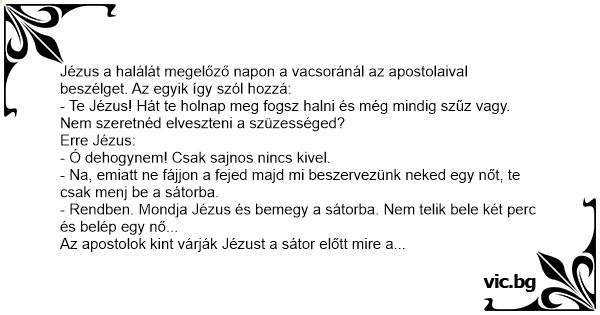 - Rendben. Mondja Jézus és bemegy a sátorba. Nem telik bele két perc és belép egy nő...