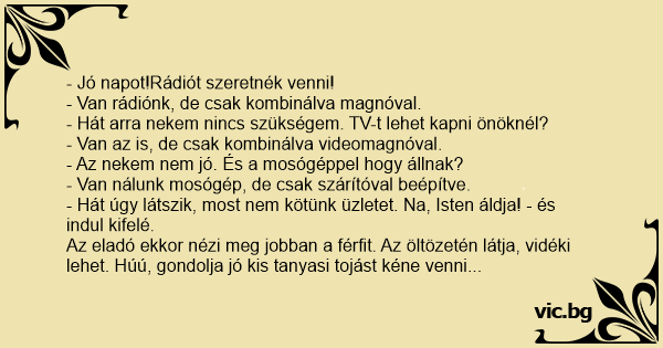 Az eladó ekkor nézi meg jobban a férfit. Az öltözetén látja, vidéki lehet. Húú, gondolja jó kis tanyasi tojást kéne venni tőle, ha már ilyen jól elbeszélgettek.