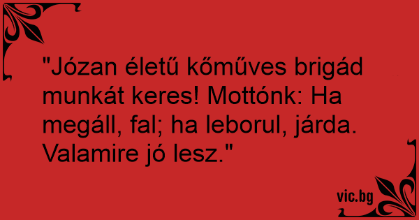 "Józan életű kőműves brigád munkát keres! Mottónk: Ha megáll, fal; ha leborul, járda. Valamire jó lesz."