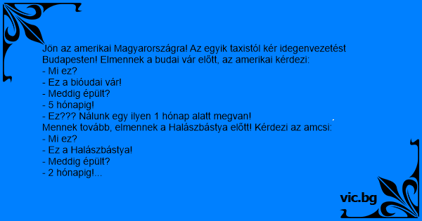 Jön az amerikai Magyarországra! Az egyik taxistól kér idegenvezetést Budapesten! Elmennek a budai vár előtt, az amerikai kérdezi: