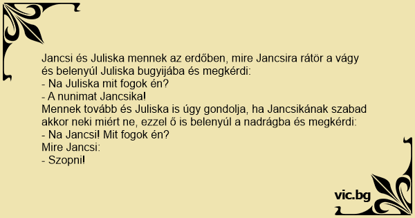 Mennek tovább és Juliska is úgy gondolja, ha Jancsikának szabad akkor neki miért ne, ezzel ő is belenyúl a nadrágba és megkérdi: