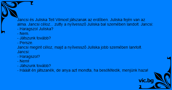 Jancsi és Juliska Tell Vilmost játszanak az erdőben. Juliska fején van az alma. Jancsi céloz... zutty a nyílvessző Juliska bal szemében landolt. Jancsi: