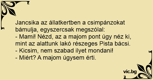 - Mami! Nézd, az a majom pont úgy néz ki, mint az alattunk lakó részeges Pista bácsi.