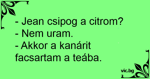 Ptá se lord sluhy: „Jean, má citron křidélka?” „Ne, pane.” „Jean, má citron nožičky?” „Ne, pane.” „Tak to jsem si do čaje vymačkal kanárka!”