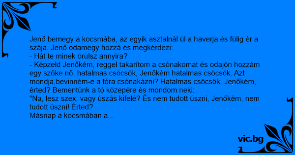 - Jenőkém, ne is kérdezd. Reggel, ahogy takarítom a csónakot, odajön hozzám egy fekete nő. Kérdezi, hogy beviszem-e a tóra. Ahogy a tó közepére érünk, kérdezem tőle, hogy szex vagy úszás. Mire levetette a ruháját, és akkora farka volt, mint az evezőlapát! Én meg nem tudok úszni Jenőkém, nem tudok úszni! Érted?!
