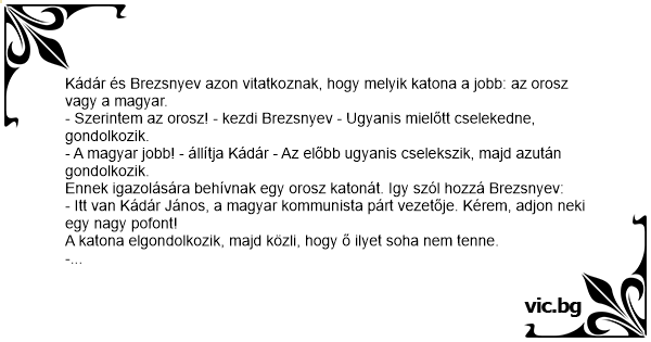 Ennek igazolására behívnak egy orosz katonát. Igy szól hozzá Brezsnyev: