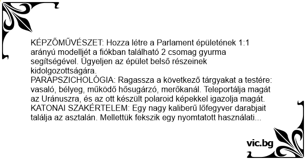 PARAPSZICHOLÓGIA: Ragassza a következő tárgyakat a testére: vasaló, bélyeg, működő hősugárzó, merőkanál. Teleportálja magát az Uránuszra, és az ott készült polaroid képekkel igazolja magát.